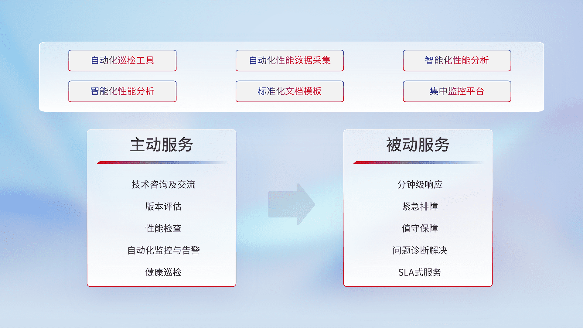 智能化工具和标准化文档,,,保障服务质量,,,提供主动服务(包含技术咨询、、、、版本评估、、、性能检查、、、自动化监控与告警、、健康巡检)和被动服务包含(分钟级响应、、、、紧急排障、、值守保障、、、、问题诊断解决、、SLA服务)。。。